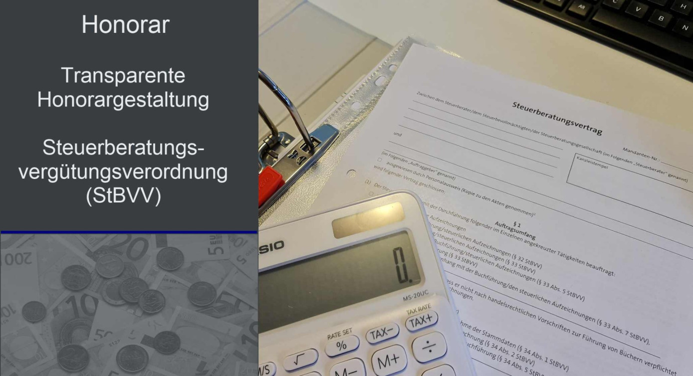 Das Honorar richtet sich in den Standardfällen (bspw. Lohnbuchhaltung, Finanzbuchhaltung, Jahresabschlüsse und Steuererklärungen) nach den gesetzlichen Vorgaben der Steuerberatervergütungsverordnung (StBVV)